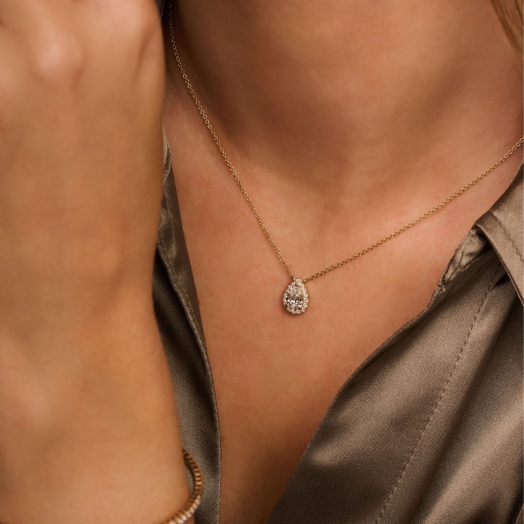 The Pear Shape Solitaire Entourage necklace is designed to maximize brilliance. A lab grown pear shaped diamond is surrounded by accent diamonds that intensify its fire and presence. The halo design enhances the center stone while maintaining refined proportions. Set in 14K recycled gold, this lab grown diamond necklace offers luminous elegance and timeless craftsmanship.