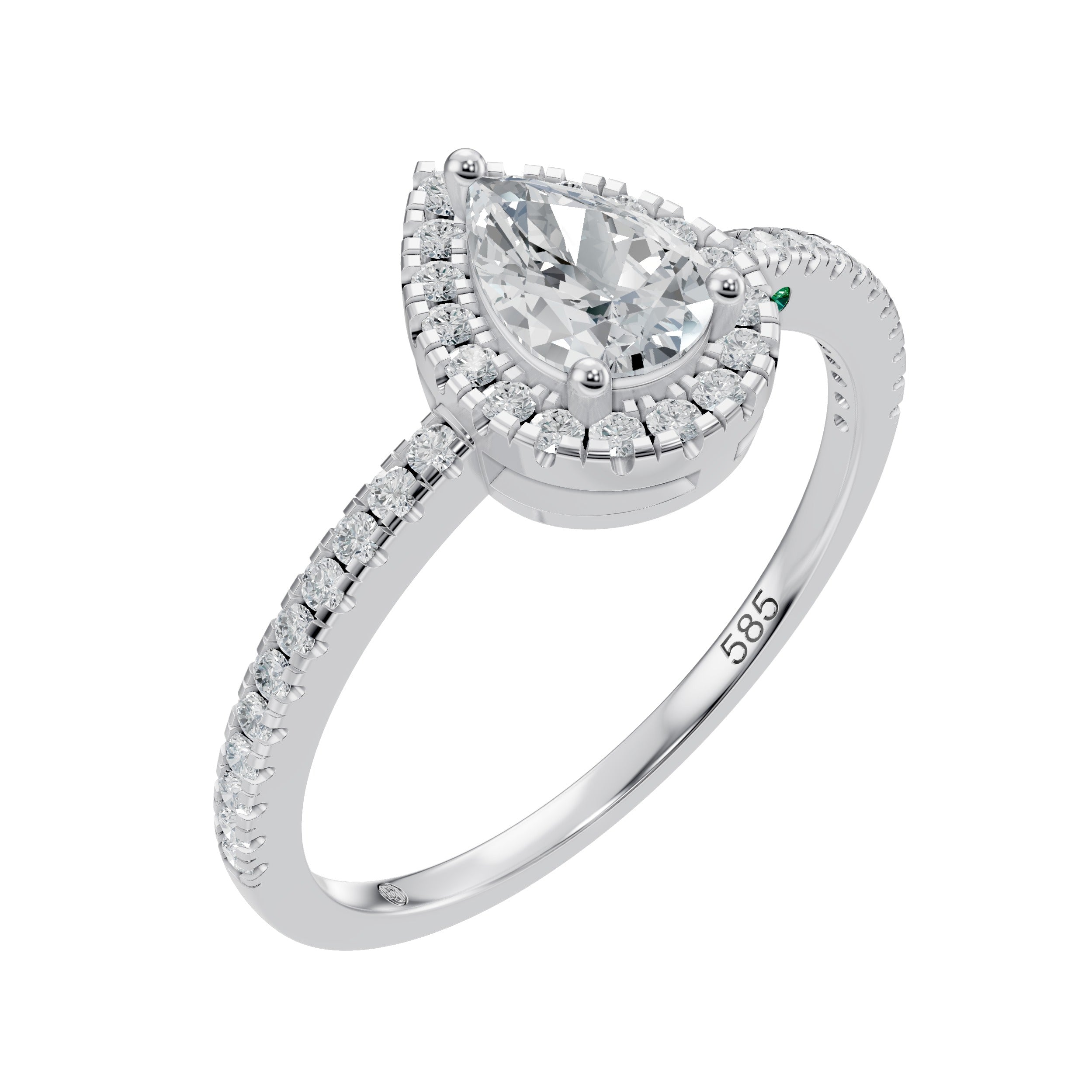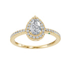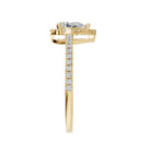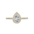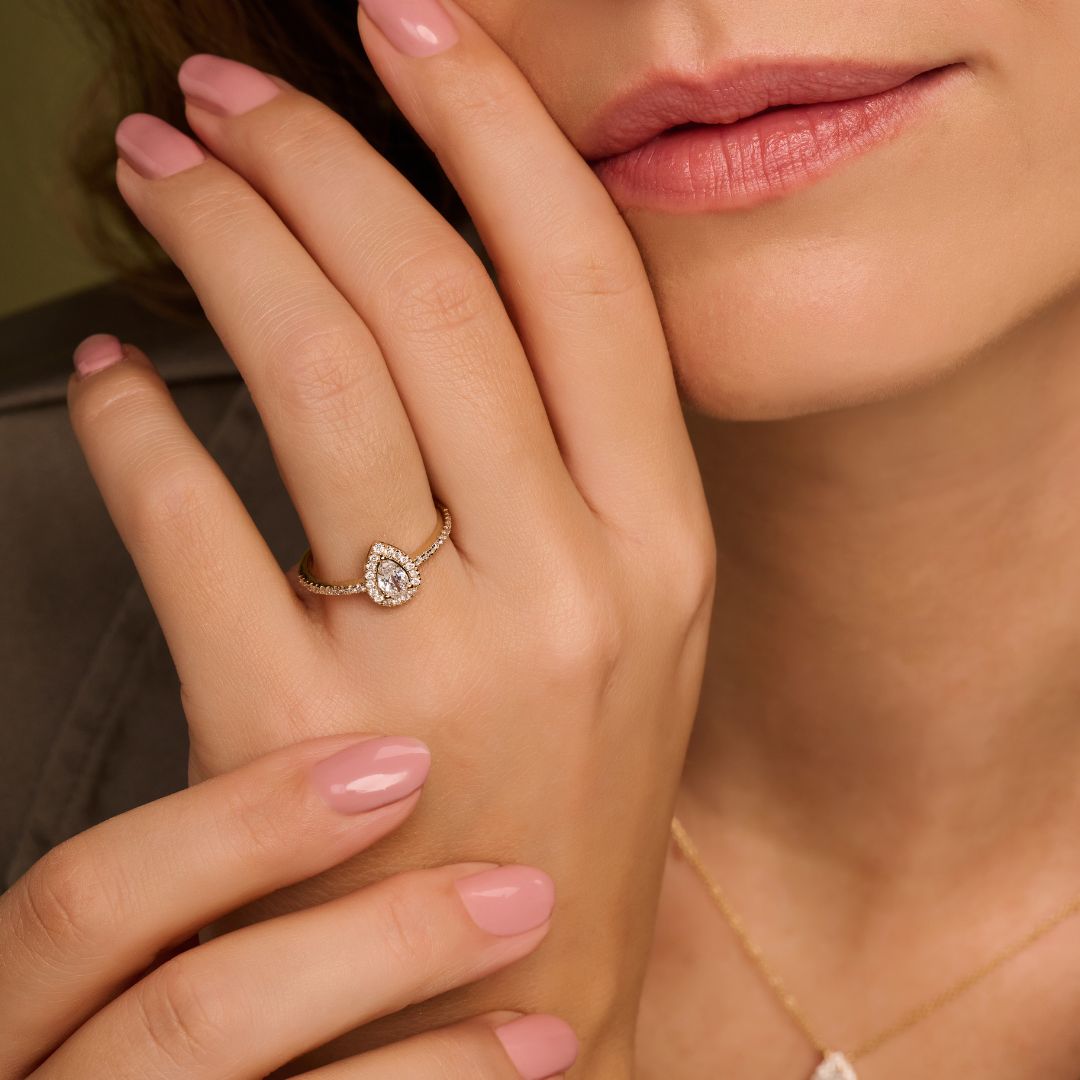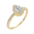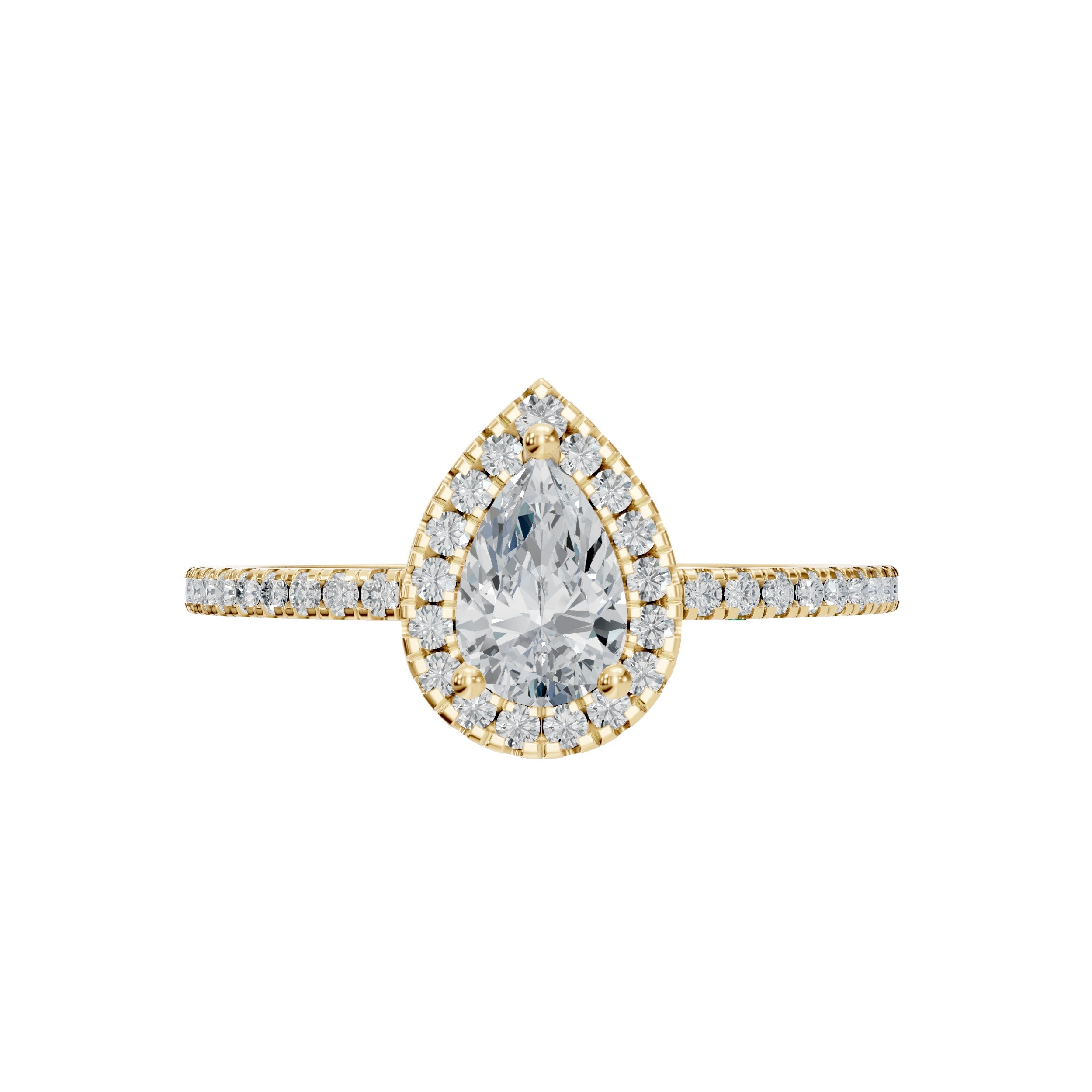 The Pear Shape Solitaire Entourage ring is designed for maximum brilliance and presence. A lab grown pear shaped diamond is surrounded by accent diamonds that amplify its sparkle, while additional stones along the band create depth and radiance. Crafted in 14K recycled gold, this engagement ring offers a luxurious yet harmonious design that celebrates light, elegance, and enduring craftsmanship.