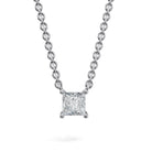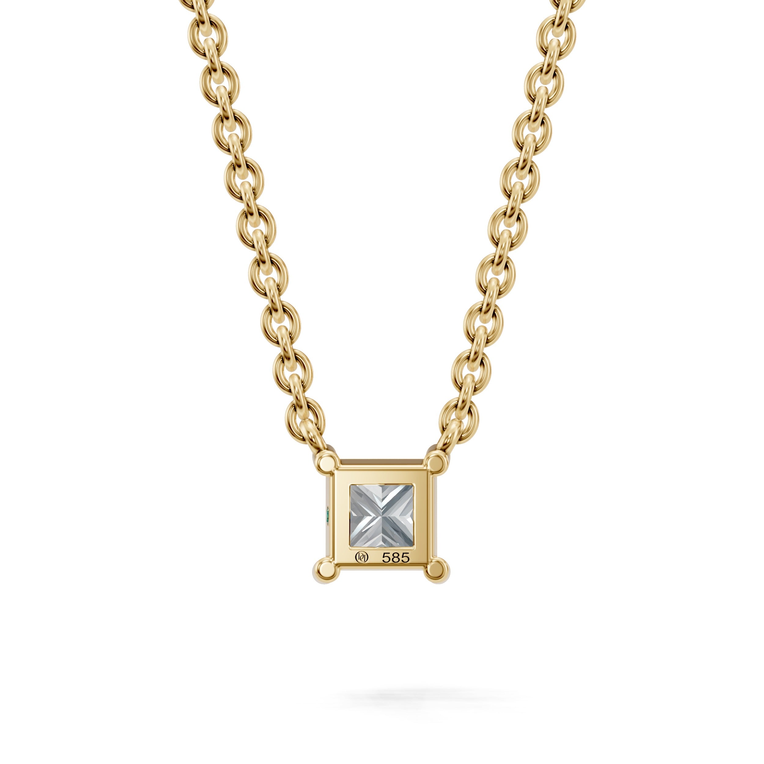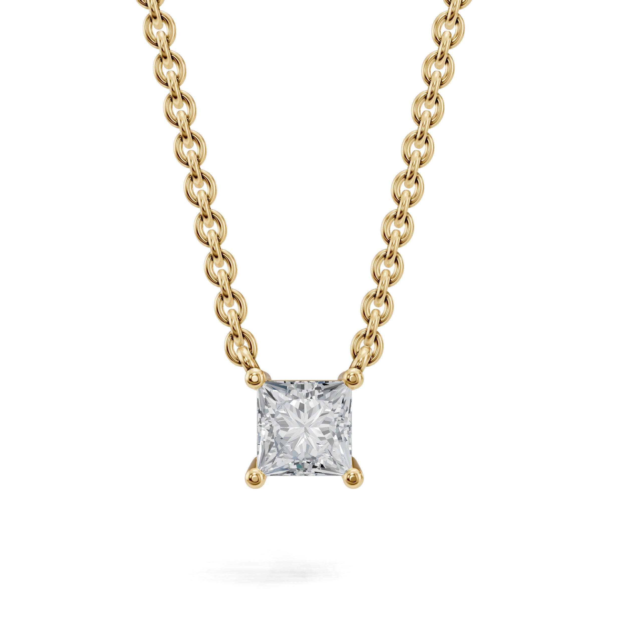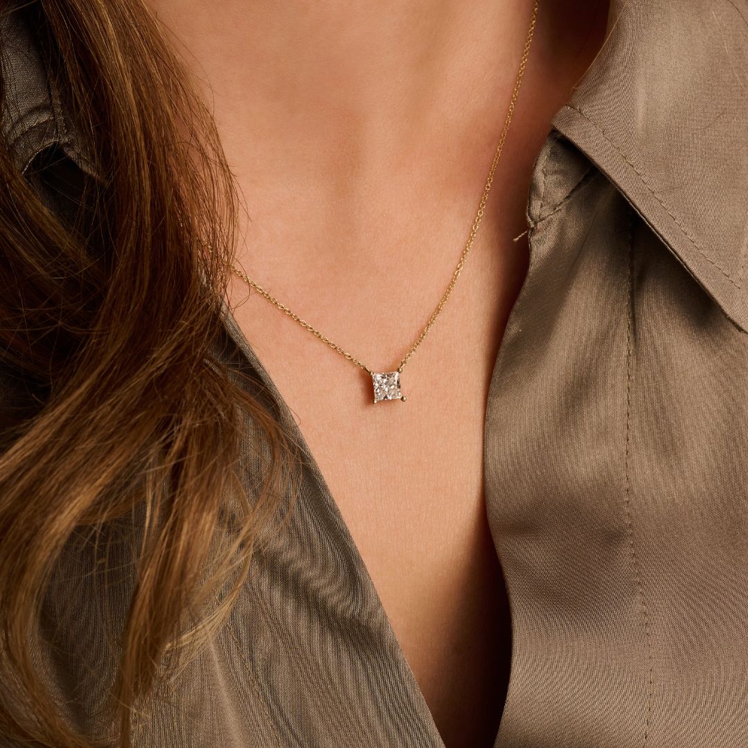 This 14K gold Princess Shape Solitaire diamond necklace features a lab grown princess cut diamond with sharp angles and exceptional brilliance. The square silhouette maximizes light reflection, creating intense sparkle in a refined solitaire pendant design. Suspended from a delicate 14K recycled gold chain, the diamond remains the focal point. This lab grown diamond necklace combines modern elegance, ethical craftsmanship, and timeless luxury for everyday sophistication.
